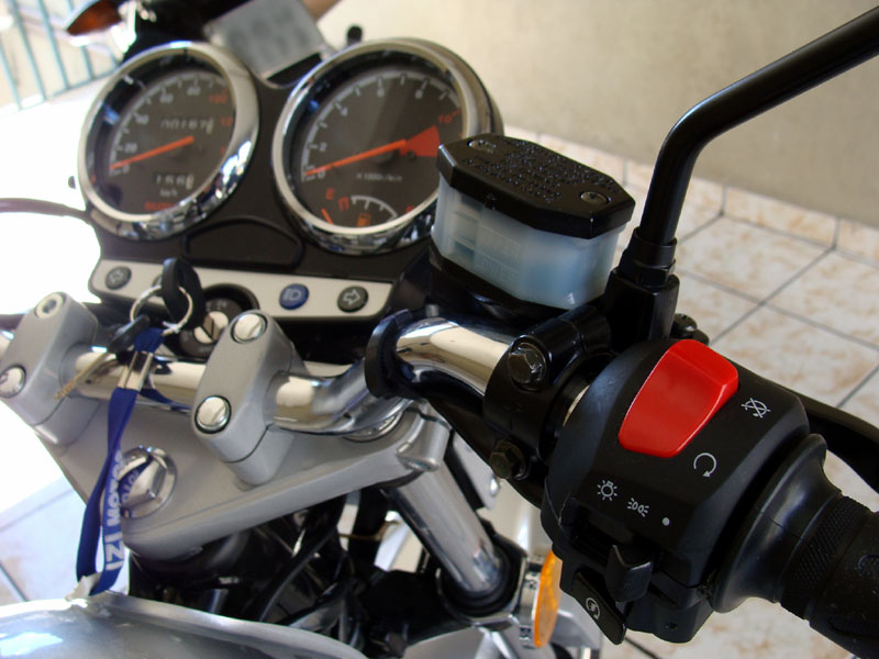 Percebi também que o manete de freio dianteiro é um pouco baixo. Apesar de funcionar muito bem, ele só começa a ter ação mesmo depois de ter percorrido metade do curso proposto. Acredito que isso pode ser resolvido com uma regulagem mais profissional, pois como percebi, os mecânicos da concessionária onde eu comprei a moto não souberam ativa-la muito bem.
